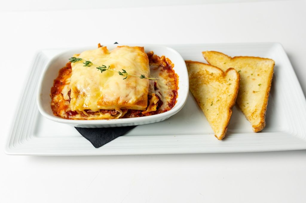 Layered pasta with rich meat sauce, béchamel, and mozzarella, served with garlic bread