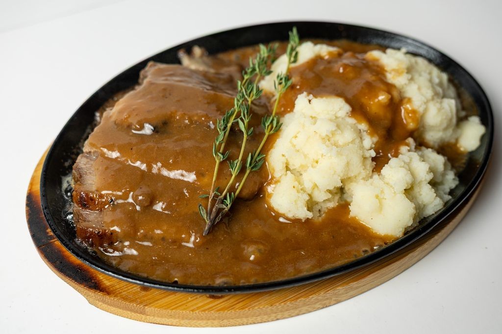 Tender beef brisket with gravy and mashed potato or java rice, sizzling hot