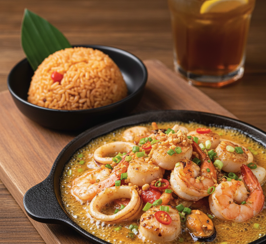Mixed seafood with house garlic butter and teriyaki sauce, java rice